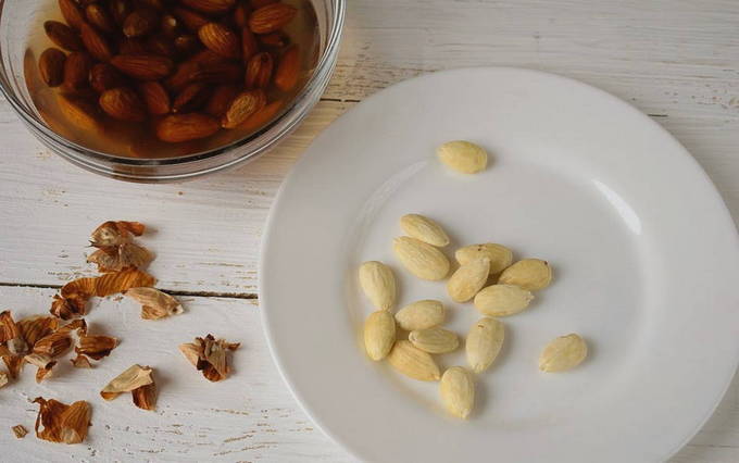 - Was amandelen en giet 20 minuten kokend water en schil ze.