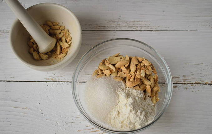 - Voeg bloem, vanilline en suiker toe aan amandelen die in vrij grote stukken zijn gehakt.