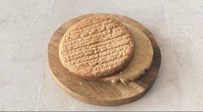 - Verdeel de biscuitcake in de lengte in twee delen en week deze in met voorgesmolten ijs.