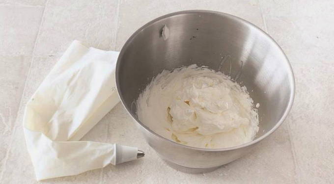 - Klop het afgekoelde ganachemengsel tot een luchtige, lichte massa en breng het over in een spuitzak met hulpstukken.