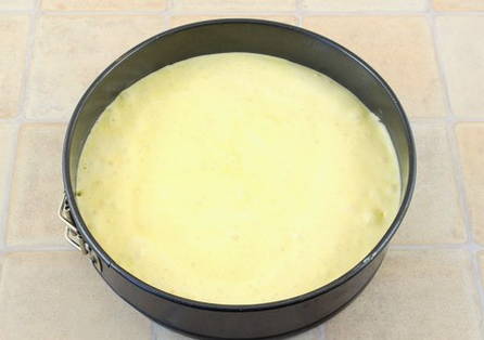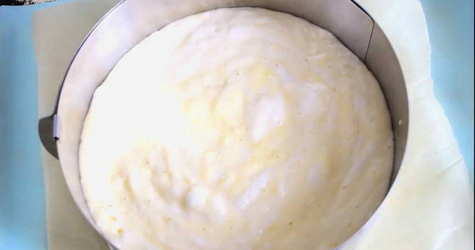 - Het deeg is klaar om te bakken. Bedek de bodem en randen van de ovenschaal met perkamentpapier en vul met deeg. We sturen het 40-50 minuten naar een voorverwarmde oven op 180 graden.