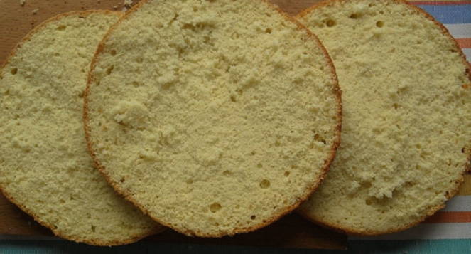 - Koel de afgewerkte cakes en snijd ze voorzichtig in de lengte in drie gelijke delen. Het is beter om een gekarteld mes te gebruiken.