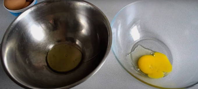 - Scheid de dooiers zorgvuldig van het wit. We gebruiken het eiwit later en kloppen de dooiers tot er een luchtig schuim ontstaat.