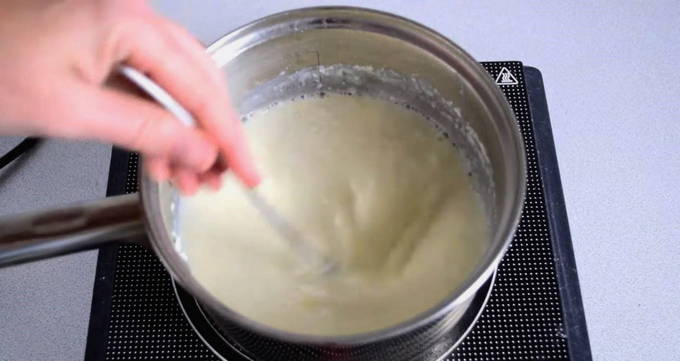 Zet op middelhoog vuur een pan met melk en boter om op te warmen. Zodra de boter smelt, moet je hem uitzetten.