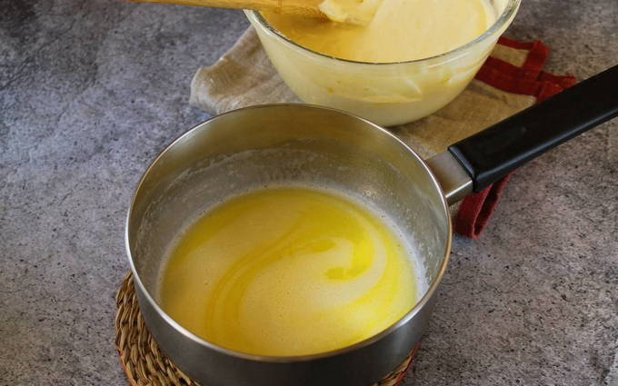 Zet op middelhoog vuur een pan met melk en boter om op te warmen. Zodra de boter smelt, moet je hem uitzetten.
