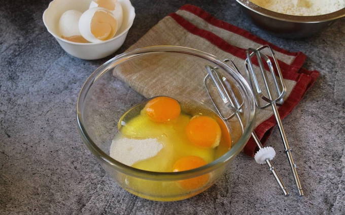 - Begin langzaam eieren, kristalsuiker en water op kamertemperatuur te kloppen met een mixer, waarbij de snelheid geleidelijk wordt verhoogd. Zodra zich een dicht, stabiel schuim vormt, bloem met bakpoeder en aardappelzetmeel erbij zeven. Blijf roeren met een garde of spatel en roer de kokosvlokken door het deeg.
