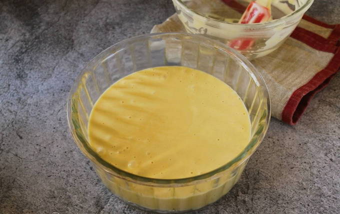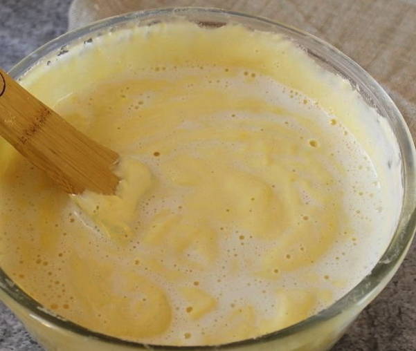 - Laten we verder gaan met het bereiden van de room: klop in een kom eieren, kristalsuiker en vanillesuiker. Giet de door een zeef gezeefde bloem erbij en blijf goed mengen. Giet melk bij het mengsel en stuur het naar een pan op laag vuur. Onder voortdurend roeren, aan de kook brengen. Haal van het vuur en laat afkoelen.