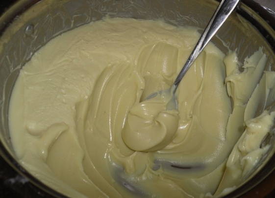 - Klop de zachte boter luchtig en meng geleidelijk met het melk-chocolademengsel. Het resultaat is een zeer lichte en luchtige crème met een gladde textuur. Om te voorkomen dat de crème uithardt, haasten we ons naar de volgende fase.