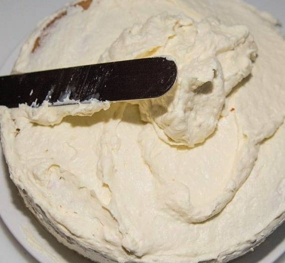Giet de cakes met melkimpregnatie, waarvoor we 2 eetlepels suiker oplossen in 50 ml melk. Vet de cakes vervolgens in met room en verbind ze met elkaar.