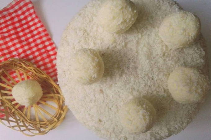 Nadat de cake 4-5 uur is afgekoeld, kun je beginnen met decoreren. Bestrooi traditioneel met kokos en versier met kleine Rafaello-snoepjes. De taart is klaar.