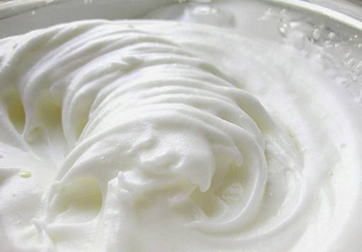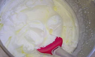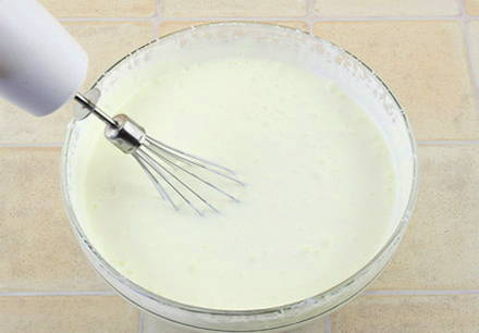 - Bereid de crème voor. Klop de gekoelde room tot knapperige pieken, voeg dan geleidelijk suiker toe en blijf nog 5-7 minuten kloppen.