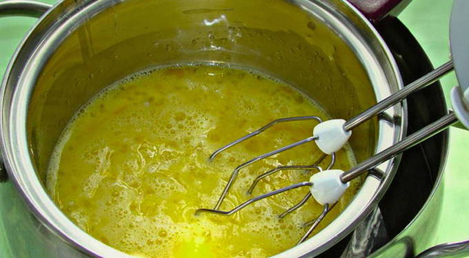 - Breek de eieren in een pan, voeg suiker toe en doe het in een waterbad. Klop de eieren met een mixer op lage snelheid. De massa mag niet te heet worden. Haal de pan van het vuur en blijf kloppen tot er een dik, dik schuim ontstaat.