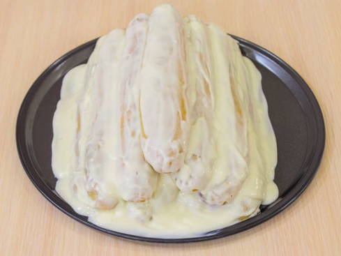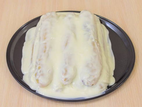 - Plaats dan nog twee lagen van twee en één buizen, bedek ze met crème.