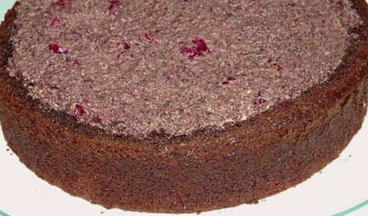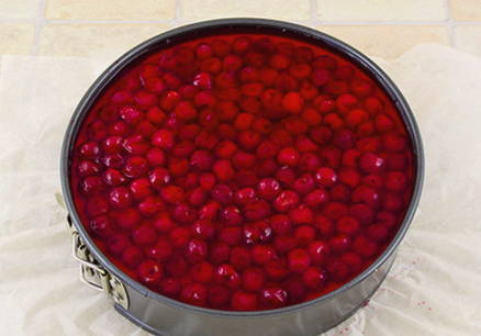 - Vet de eerste cake in met chocoladeroom, verdeel een deel van de kers erover.