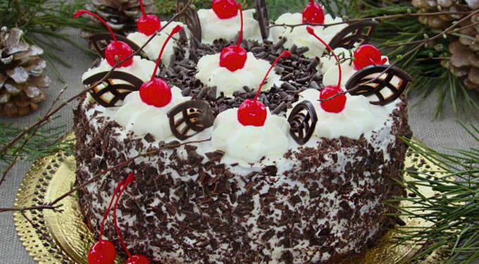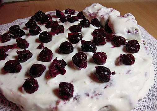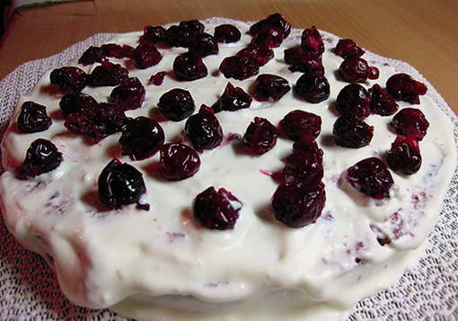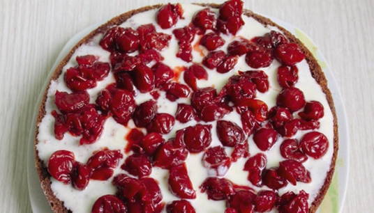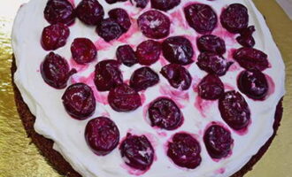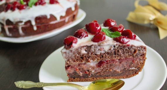 - Leg de cakes op elkaar, smeer ze in met room en bekleed ze met kersen. Je kunt de taart naar eigen smaak versieren met chocolade en noten. Zet het een paar uur in de koelkast om te weken.