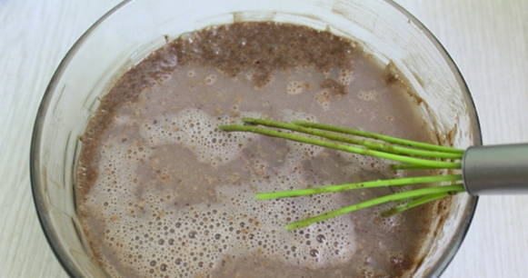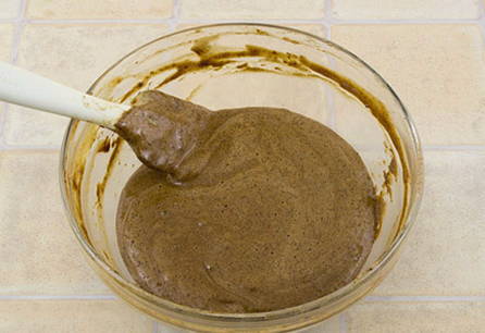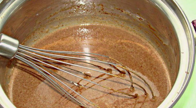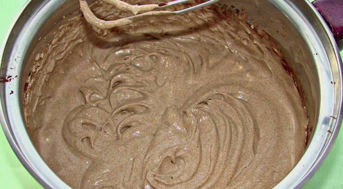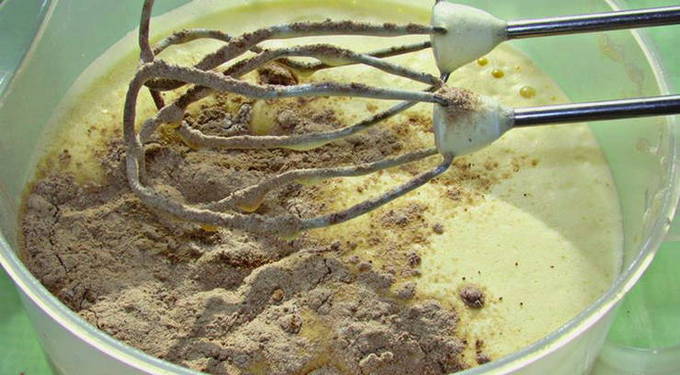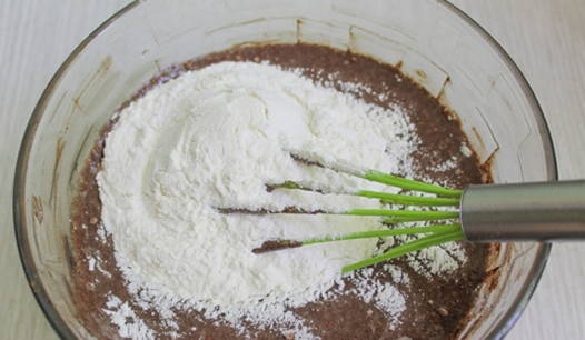 - Giet vervolgens in een dunne stroom de helft van de eerder gesmolten en afgekoelde boter, meng. Voeg dan 1/3 meer bloem en cacao toe. Voeg dan opnieuw de olie toe en daarna het resterende droge mengsel.