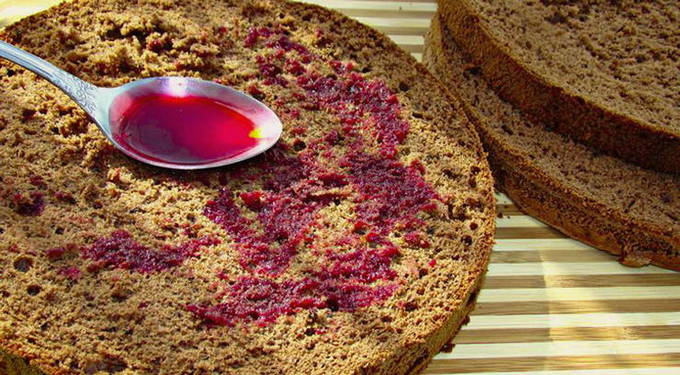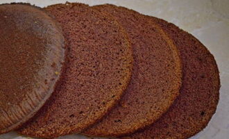 - Als alle ingrediënten klaar zijn, kun je beginnen met het verzamelen van de cake. Snijd de ongelijke bovenkant en zijkanten van de cakes af, verzadig ze met kersensiroop.