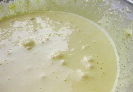 - Giet vervolgens de gelatine-oplossing in de wrongelmassa en klop de inhoud van de kom een minuut lang.