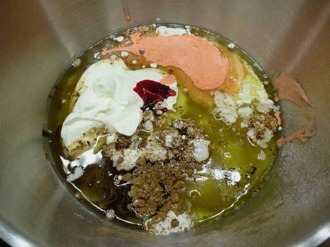 - Voeg vervolgens eieren, olie, room, zure room en kleurstof toe. Klop alle ingrediënten 3-4 minuten met een mixer. Laat het deeg 10 minuten aan de zijlijn rusten.