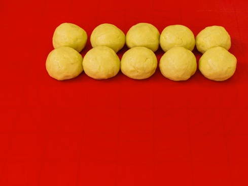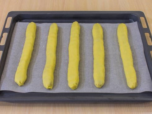 - Rol elk deel van het deeg uit tot een strook van 25 centimeter lang en 7 centimeter breed.