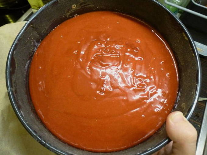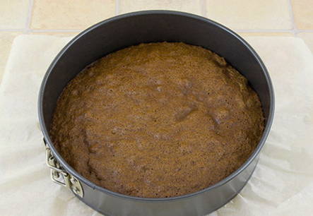 - Leg perkament op de bodem van de vorm, vet de vorm zelf in met boter. Giet 1/3 van het deeg in de vorm en bak de cake 20-40 minuten op 180 graden. Bak nog 2 cakes op dezelfde manier. Laat alle cakes volledig afkoelen.