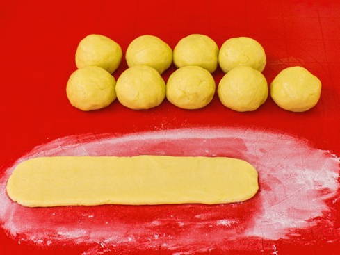 - Knijp het deeg rond de bessen zodat je gevulde buisjes krijgt. Bedek een bakplaat met perkament, bekleed de buizen met de naad naar beneden. Bak ze 20-25 minuten in de oven op 180 graden.