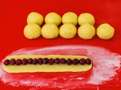 - Was de kersen, verwijder de zaadjes. Leg een rij kersen in het midden van elke strook.