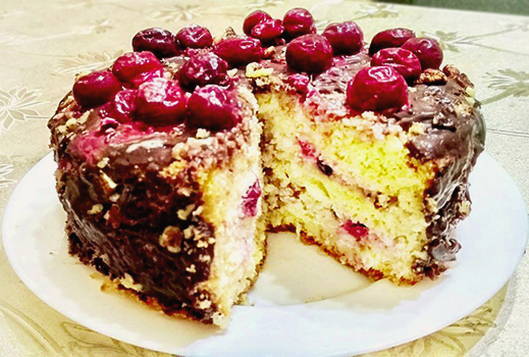- Werk de cake af met een derde korst, bestrijk met de resterende slagroom, garneer met geraspte chocolade en kersen. U kunt thee zetten en gasten trakteren.