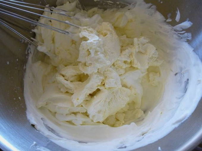 - Voeg in meerdere keren de mascarpone toe aan de slagroom en roer de room door met een garde. Plaats de afgewerkte room 3-4 uur in de koelkast.