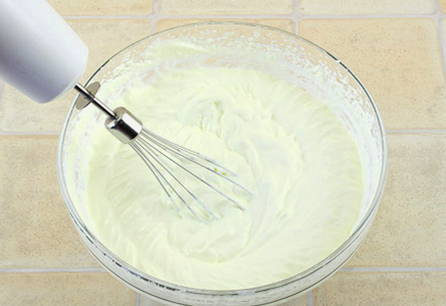 - Koel de room om de room te maken. Klop de afgekoelde room met een mixer op gemiddelde snelheid tot er belletjes ontstaan. Voeg daarna direct de poedersuiker toe en blijf de room kloppen tot stabiele pieken.