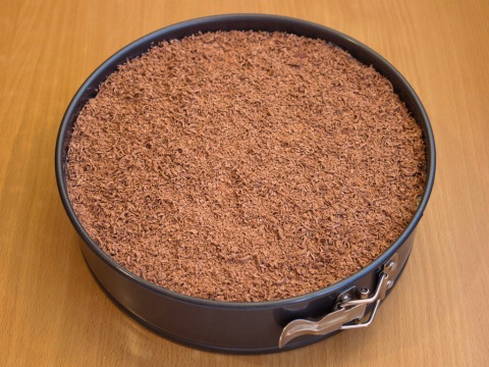- Rasp de chocolade op een fijne rasp. Bestrooi de cake met chocoladeschilfers en zet 3-4 uur in de koelkast.