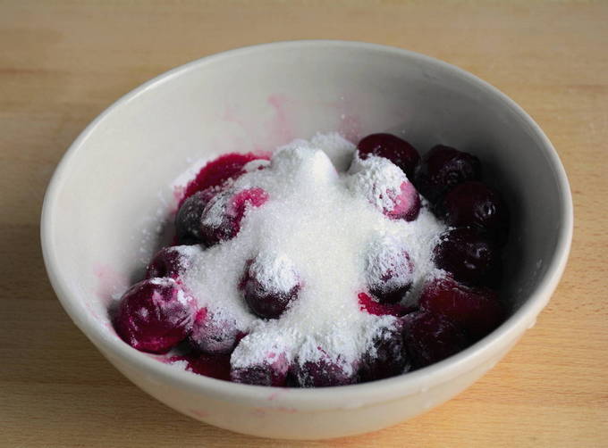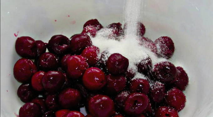 - Verwijder de pitjes van de kersen en bedek deze met 50 gram suiker, laat even staan om sap te vormen.