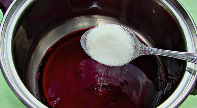 - Giet vervolgens het kersensap in een pan, voeg de rest van de suiker toe en kook de siroop 5 minuten.