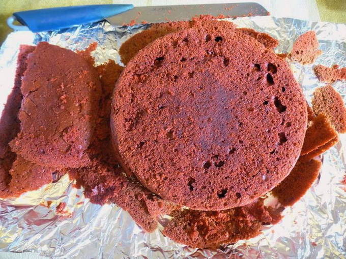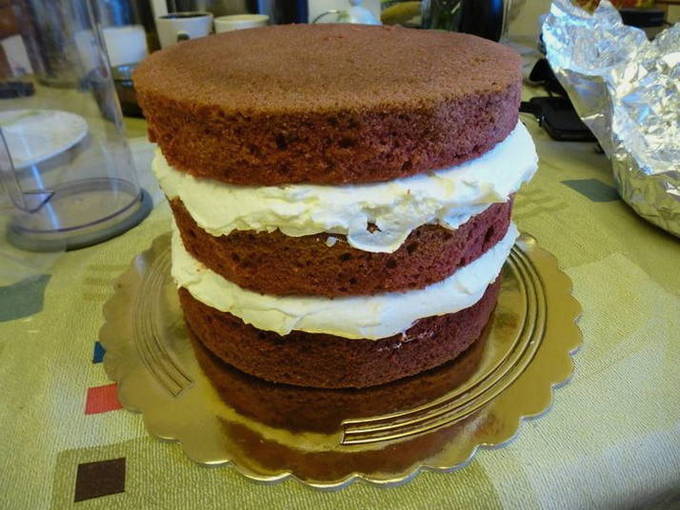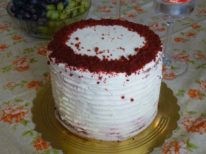 - Bestrijk de cake vervolgens aan de boven- en zijkanten met room, decoreer met koekkruimels. Zet de cake een nacht in de koelkast om te laten weken. De volgende dag is de Red Velvet cake klaar.