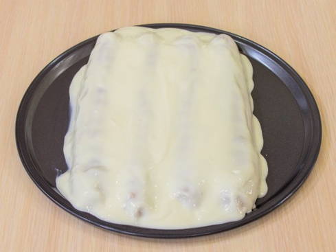 - Leg vervolgens een laag van drie buizen, smeer deze ook in met room.