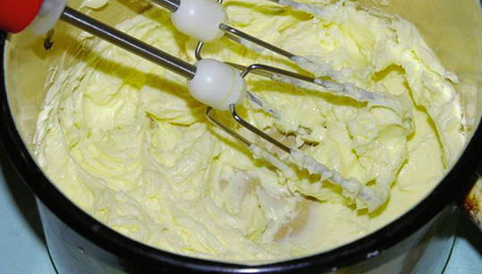 - Klop de zachte boter met een mixer. Meng de gecondenseerde melk apart met de kersenbrandewijn. Voeg het resulterende mengsel toe aan de opgeklopte boter en meng goed.