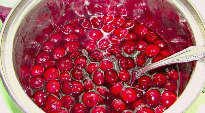 - Bedek de ontpitte kersen met suiker en laat een paar uur staan om het sap te laten vloeien en de suiker volledig op te lossen. Doe vervolgens de kersen en de siroop in een pan, zet op het vuur en kook gedurende 10-15 minuten.
