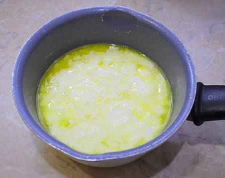 Giet melk in een pan en voeg boter toe. Combineer ingrediënten en breng aan de kook. De massa moet volledig homogeen worden.
