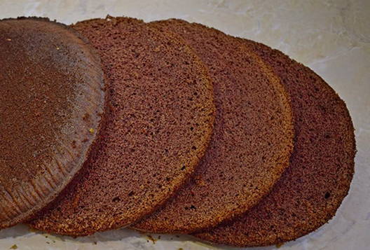 - Als alle ingrediënten klaar zijn, kun je beginnen met het verzamelen van de cake. Snijd de ongelijke bovenkant en zijkanten van de cakes af, verzadig ze met kersensiroop.