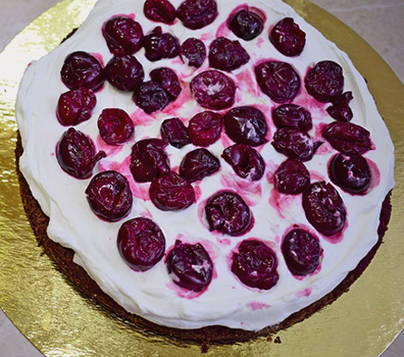 - Vet de eerste cake in met chocoladeroom, verdeel een deel van de kers erover.