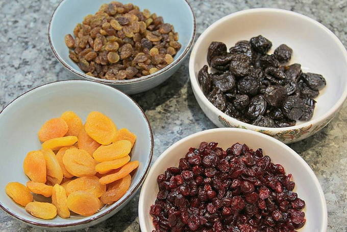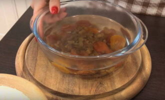 - Laten we nu beginnen met vullen. Giet pruimen, gedroogde abrikozen, rozijnen en veenbessen in verschillende containers. Vul ze gedurende 15 minuten met kokend water.