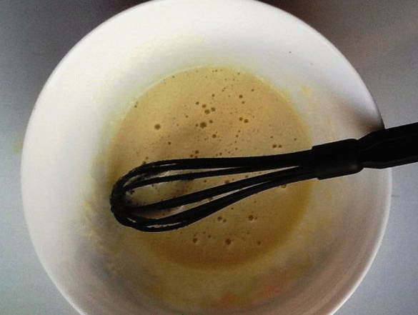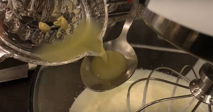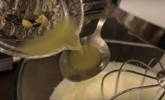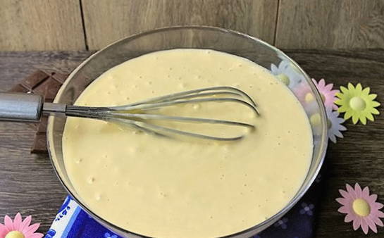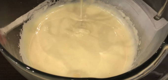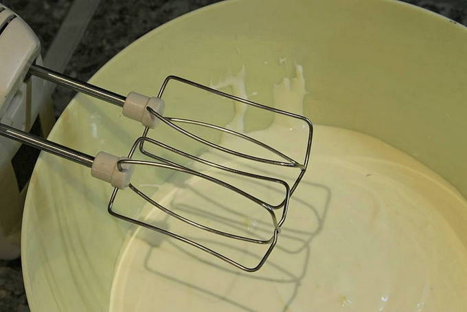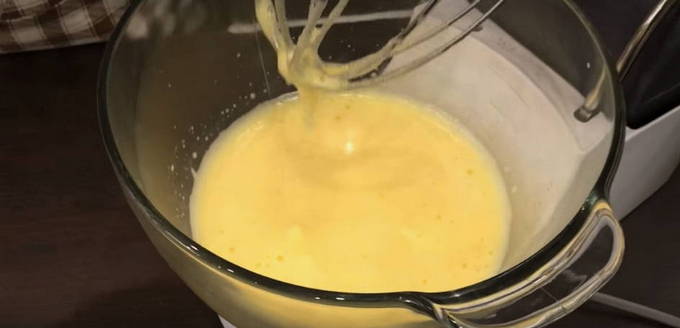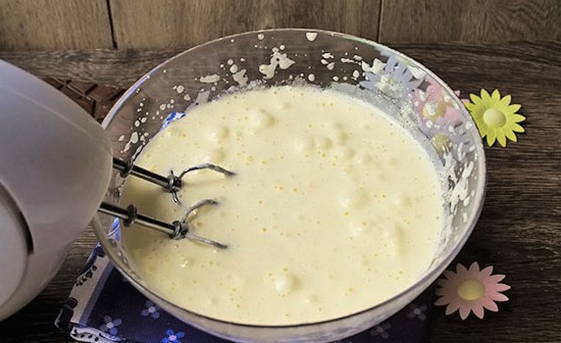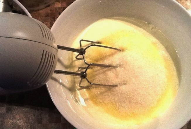 - Drijf eieren in een aparte kom, voeg een half glas suiker toe. Klop met een mixer de ingrediënten tot een wit schuim ontstaat.