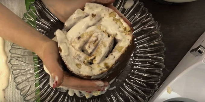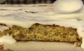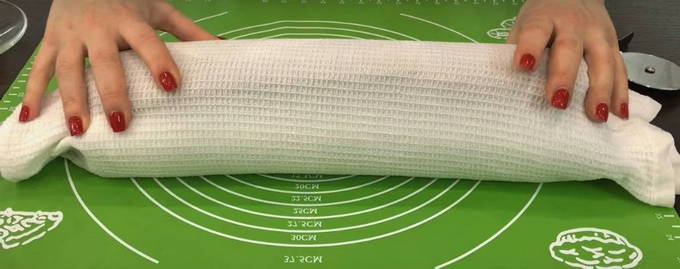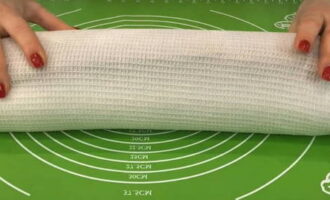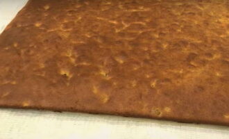 - We rollen de warme cake in een rol met een handdoek. We proberen alles snel te doen, anders zal de cake afkoelen en breken als hij wordt opgevouwen.