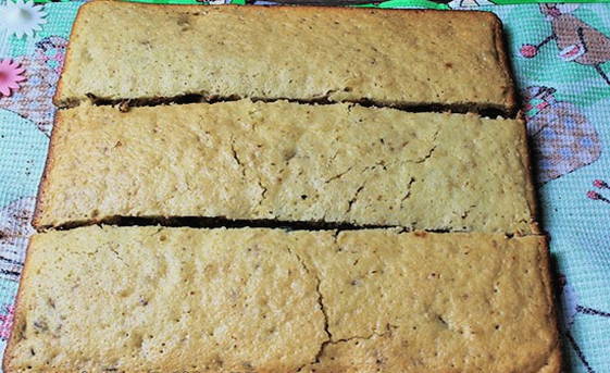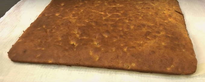 - Zet de oven 180 graden aan. Leg het deeg erin en bak 20-25 minuten. We verspreiden een licht vochtige handdoek op het werkoppervlak van de tafel en verwijderen het perkament. Leg de afgewerkte cake erop en verdeel deze in drie gelijke delen, indien gebakken op een grote bakplaat (als je twee kleinere cakelagen hebt, verdeel ze dan in twee gelijke delen).