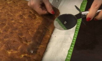 We verwijderen het perkament en leggen de cake neer. We rollen het op tot een rol. We wachten 15-20 minuten. We draaien los en beslissen welke hoogte de toekomstige "stomp" zal zijn (10, 15 of 20 cm). De benodigde afstand op de taart meten we met een liniaal. We maken markeringen aan beide zijden horizontaal.