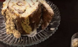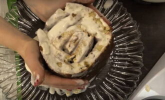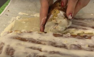 We vouwen de eerste cake in een rol, leggen op een gerecht dat van tevoren is voorbereid voor de cake. Giet het erop en smeer de zijkanten in met room. We wikkelen de rol met de tweede strook. We proberen het stevig aan te drukken zodat de structuur niet uit elkaar valt.