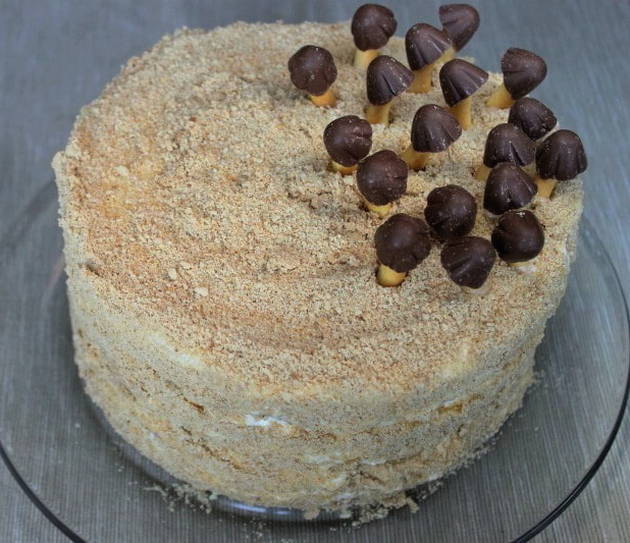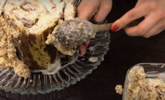 - We breken de resten van de cake in kleine kruimels met de hand of met een blender. We mengen ze met room. We beginnen de "wortels" van onze "stronk" uit te leggen. We zetten de cake 3-4 uur (of een nacht) in de koelkast.
