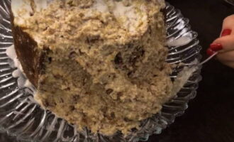 - We zetten de cake een nacht in de koelkast. Om ervoor te zorgen dat de room alle lagen beter verzadigt, bedek je de cake met een bord erop en plaats je de lading.