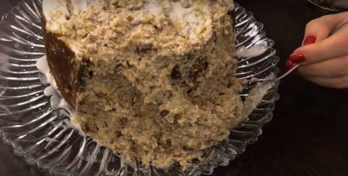 - Verdeel het glazuur over de bovenkant en zijkanten van de cake. We versieren het product met noten en creëren "wortels". We sturen het 30-40 minuten naar de koelkast. Klaar!