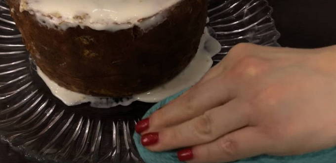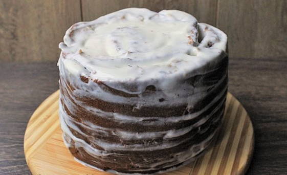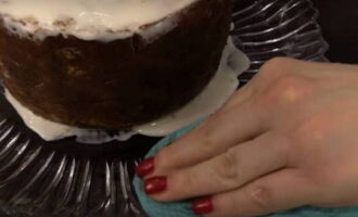 - Breng met een culinaire spatel voorzichtig het glazuur aan op de zijkanten en wortels van de cake. We tekenen lichte ongelijke strepen met een vork zodat het lijkt op de oude bast van een boom.